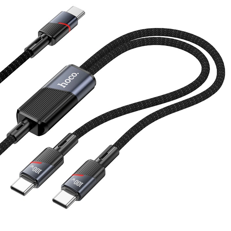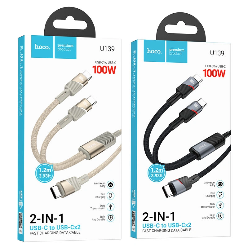 U139, Type-C to dual Type-C charging data cable, supports PD 100W fast charge, nylon braid, aluminum alloy connectors, length – 1.2m