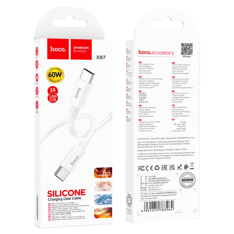 X87 Magic, Type-C to Type-C charging data cable, supports PD 60W fast charge, silicone sheath, length – 1m