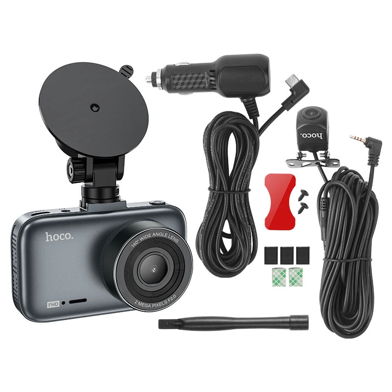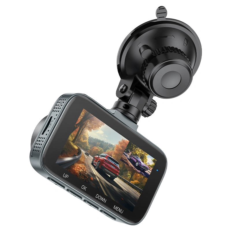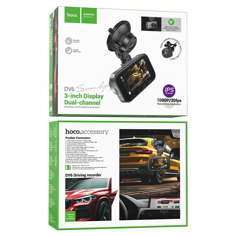 DV6, car dash cam, front 1080p and rear 720p cameras, 140° lens angle, IPS HD screen, loop recording, parking monitoring, G-sensor, starlight night vision