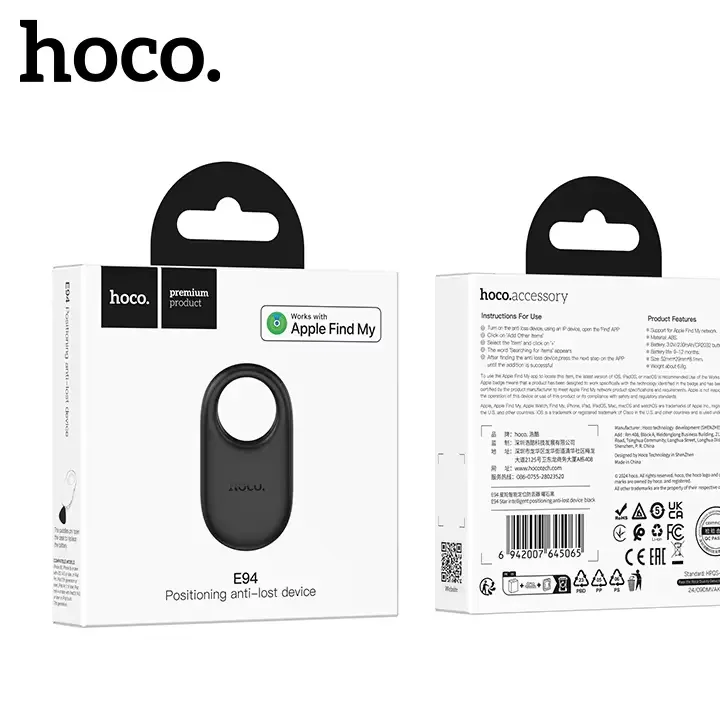 The HOCO E94 GPS AirTags Tracker is the perfect solution for keeping track of your valuables. With intelligent positioning and advanced anti-lost technology, this tracker provides seamless tracking for your items. Compatible with the Apple Find My Network, the HOCO E94 GPS AirTags Tracker allows you to locate your belongings using your iPhone or other Apple devices. Available in five stylish colors, including black, white, sapphire blue, blue star, and purple, it combines functionality with design. Never worry about losing your keys, wallet, or bags again with this highly reliable tracker.