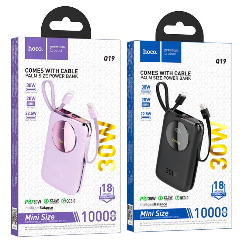 Q19 Lucky, mobile power bank, 10000mAh, Type-C input, single Type-C, single USB-A and built-in cables for Lightning and Type-C outputs, support fast charging protocols