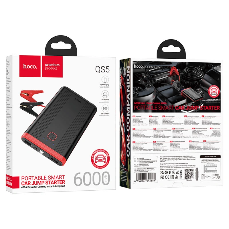 QS5 Refined, power bank 6000mAh, car jump starter, Type-C input, USB-A output, 12V car emergency starter output, with flashlight