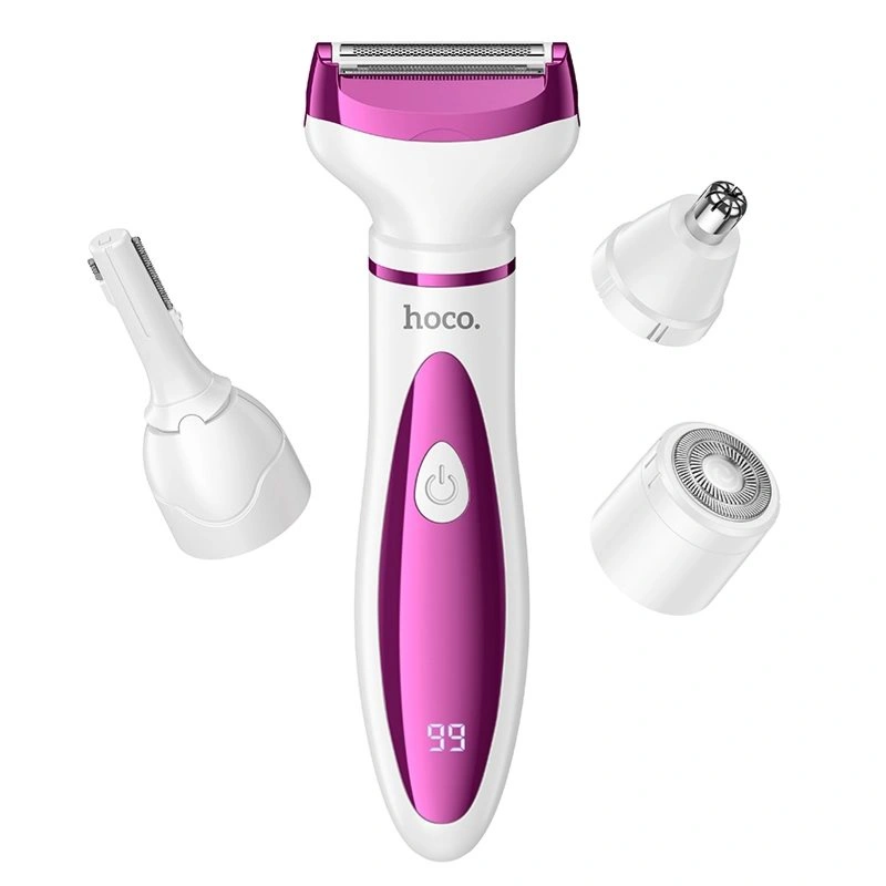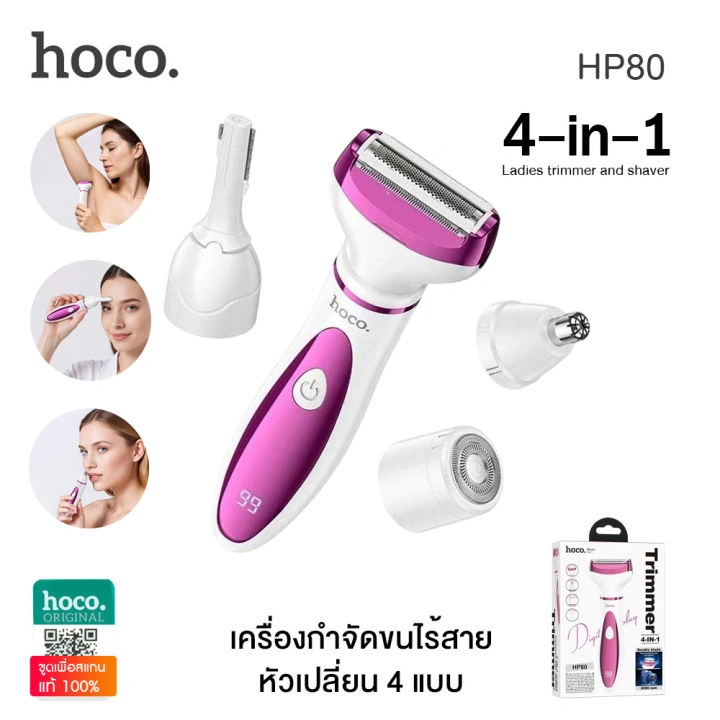 The HOCO HP80 is a 4-in-1 tool with four interchangeable heads for body shaving, nose hair trimming, rotary shaving, and eyebrow trimming. It features hypoallergenic stainless steel blades for gentle use and a high-speed motor. A digital LED display indicates battery level and charging reminders. It has a 300mAh battery that fully charges in about 2 hours and provides 65-80 minutes of cordless use. The device is IPX4 splash-proof, with washable detachable heads. It is compact and lightweight with a travel lock feature. Included accessories typically are the device, four attachments, a USB cable, a cleaning brush, and a user manual.